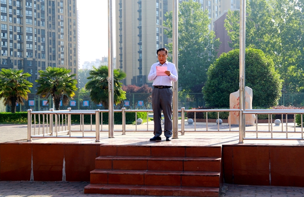 随着整齐的步伐和嘹亮的口号,国旗护卫队队员们护卫着鲜红的五星红旗庄严的步入广场。在庄严的国歌声中,在场老师和同学集体行注目礼,神情肃然的看着国旗冉冉升起,全场庄严肃穆。团委副书记方萌萌带领全体学生在国旗下重温入团誓词。在那一刻我们似乎回到了当年申请入团之时,我们站在鲜红的团旗之下,坚定的举起右手,在那一刻我们感觉到了光荣。绿海学子齐声诵读《学生宣言》,那一刻似乎让人想起了1919年一批爱国的青年学子,一批优秀的青年干部走上街头,为了新去付出自己的青春,这是一种精神,是一份责任与担当。