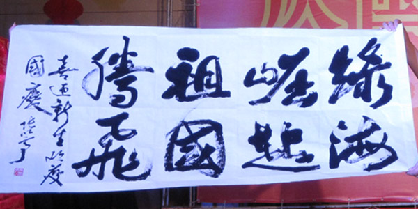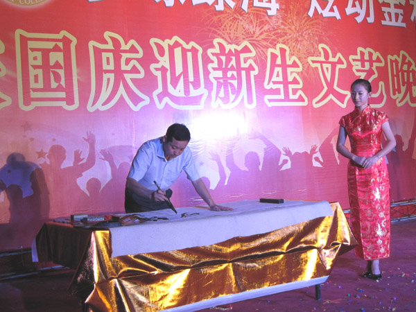歌伴舞《青花瓷》用歌声、用舞姿、用乐器仪态万千的表现了悠久的古典文艺文化。在《感恩》的朗诵表演中,院长助理、院办主任张以亭现场挥毫泼墨,书写了“祖国腾飞,绿海崛起”八个大字,气势恢宏,展示了对祖国的祝福,对绿海的祝愿。在一曲温馨动人的《相亲相爱一家人》中晚会圆满结束。