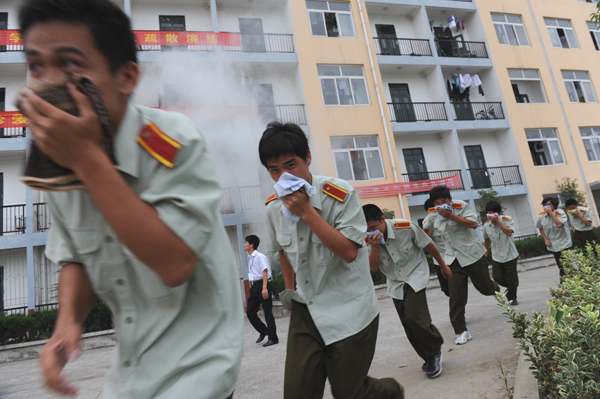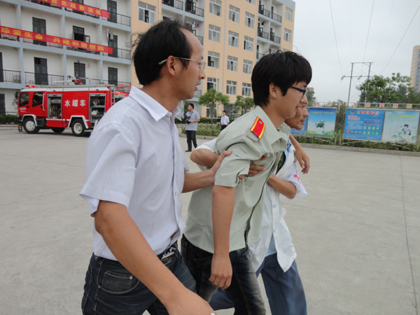 下午16时,楼层内布置人员点燃烟饼烟雾,整个楼道迅速烟雾弥漫。紧接着便是一阵刺耳的警报声长鸣,消防演练正式开始。起火楼层管理员将“险情”迅速报告给总指挥。总指挥立即通知电工拉闸关电,拨打119火警电话。这时,广播里不断发出紧急疏散的信息,通知各辅导员紧急到位,有序组织学生疏散。千余名学生在疏散人员和老师的指引下,用湿毛巾捂住口鼻,弯腰快速靠右行走,紧张有序地逃离硝烟弥漫的“火场”。在到达集结区后,辅导员及时清点学生人数。经过一个多小时的演练,“险情”排除,演习任务圆满完成。