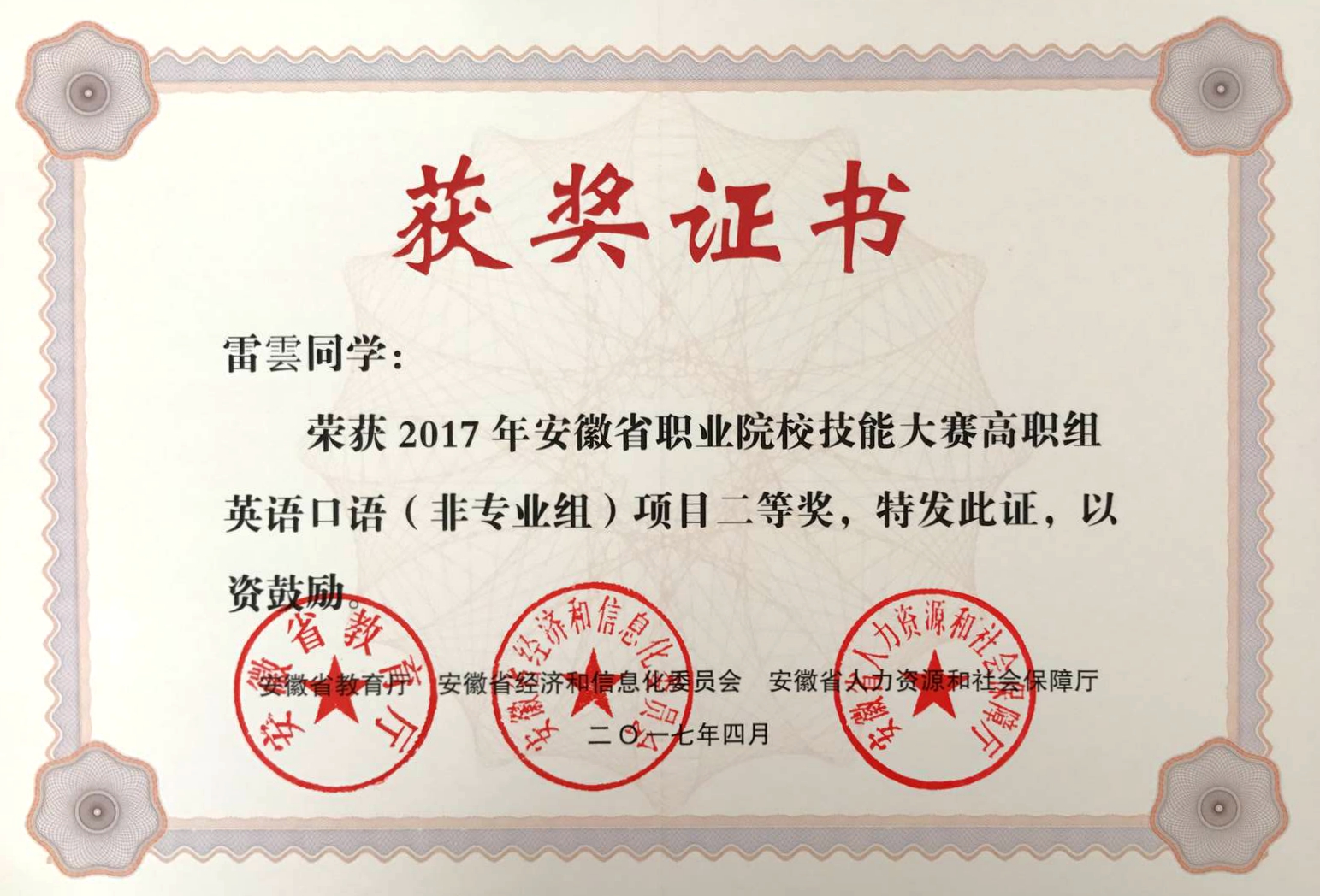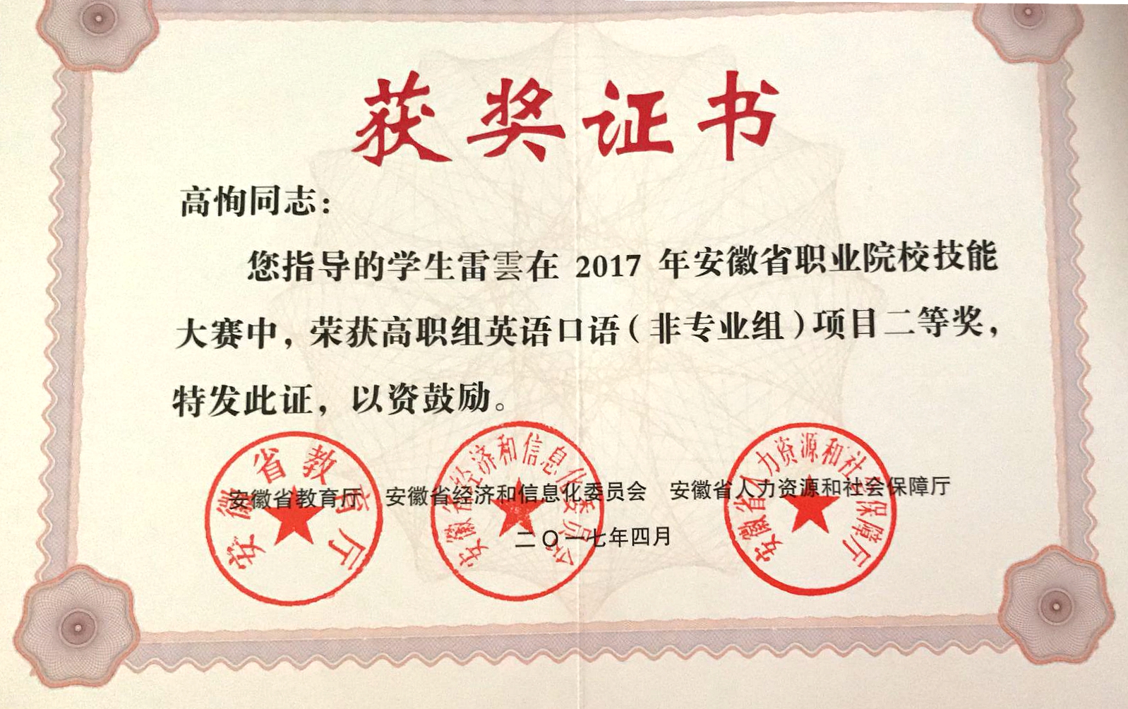 近日,从安徽省教育厅获悉,365集团学子雷雲在2017年安徽省职业院校技能大赛上,与全省35所职业院校58名选手同台竞技,经过激烈角逐,获得英语口语(非专业组)赛项二等奖,其指导老师高恂获得优秀指导教师称号。
