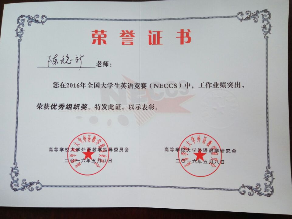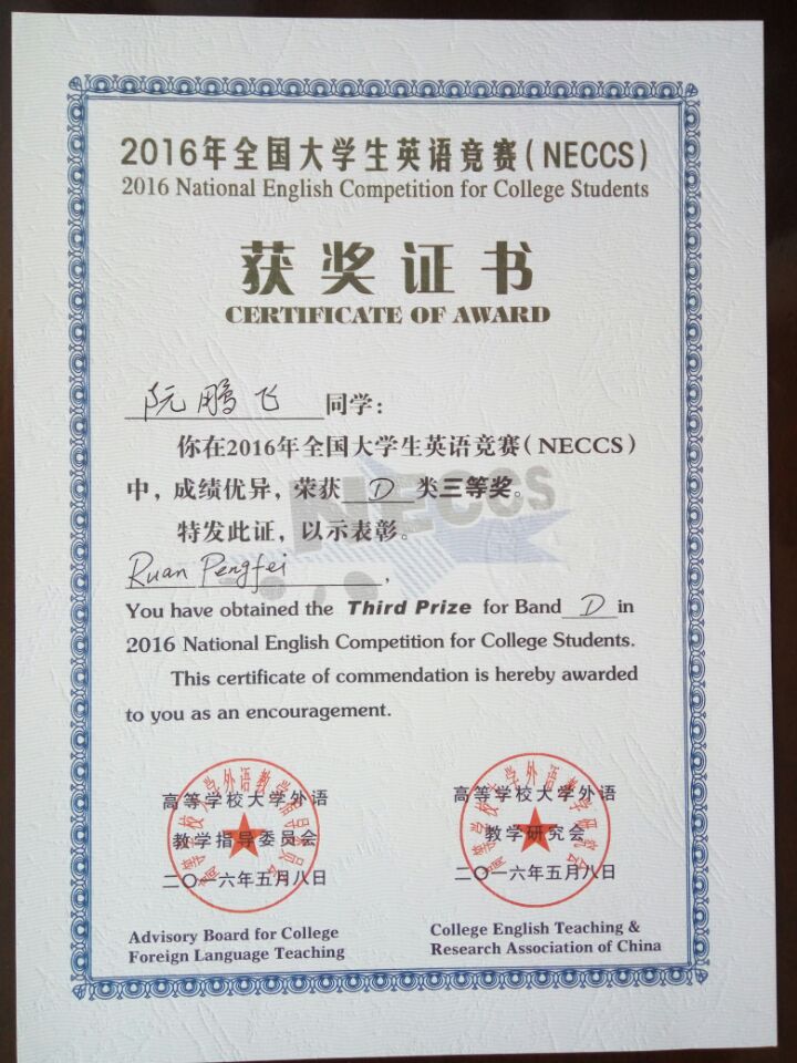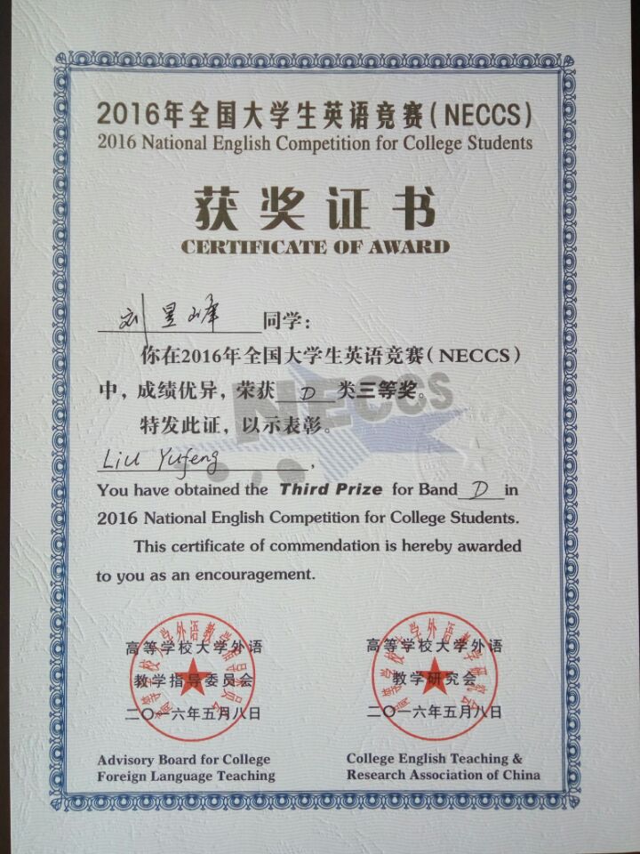 近日,从全国大学生英语竞赛组委会传来喜讯,365集团院三名学生获2016年全国大学生英语竞赛(NECCS)D类(高职高专非英语专业学生和艺体类本科生)二、三等奖。