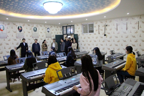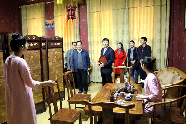 耿金岭一行在陈孝云等学院领导的陪同下,先后察看了茶道文化体验中心、礼乐堂、书艺堂、形体艺术堂、国学社、项目路演厅,每到一处,大家驻足观看,感受绿海学院特有的育人模式和浓厚的人文气息。