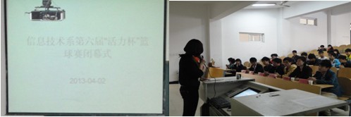 2013年4月2日,历时两周的信息技术系第六届“活力杯”篮球赛终于在阶梯教室落下帷幕。院学生会主席郑涛、管理系主席杨雪梅、外语系主席章俊、经贸系主席徐继叶、继教部主席王世灵、信息系主席夏世松和信息系学生会所有成员以及所有参赛队员出席了本次闭幕式。
