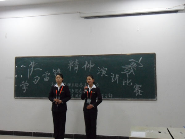 2013年3月24日,管理系在阶梯教室三举办了“学习雷锋精神”演讲比赛,学生会主席杨雪梅、李庆、组织部部长陈富、学习部部长徐菊、演讲培训班张燕、程柳琴以及管理系全体学生出席了此次比赛。