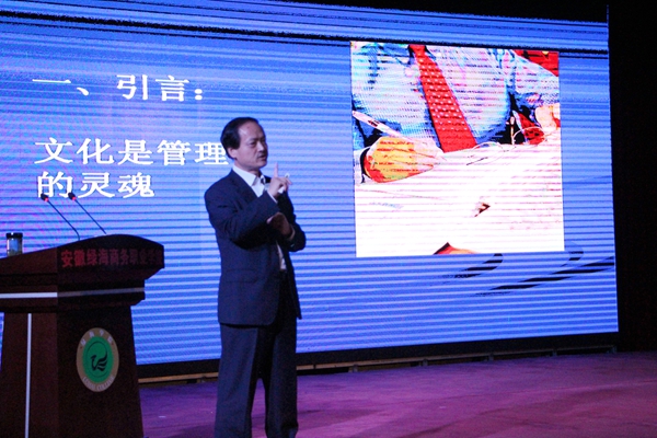 吴宗友指出,决定机器运转方式的是技术,操纵机器开关的是人,控制人们行为模式的就是文化,文化是管理的灵魂,因而作为学生,要培养自身对学院文化的认同感,从校园文化中汲取营养和能量。同时指出领导者应具备“自强不息,厚德载物,知人善任,利益共生,情感共享”的基本素质,要将校园文化建设放在首要位置,与学生建立共享共融的文化机制。整场报告会,引经据典,活泼生动,案例贴切,内容丰富,掌声不断。 报告会后,365集团董事长陈孝云表示,传统文化教育,需要学校教育首先发力,绿海学院一直坚持传承和弘扬中华优秀传统文化,发起成立了安徽省当代社会主义核心价值体系研究中心,并以核心价值观内容作为主线,完成校本国学教材《儒家经典选读》的编写,把中华优秀传统文化教育融入课程和教材体系之中,以各种形式走入学生课堂。他强调,学习中华优秀传统文化,不仅仅是会读几篇经典,会背几首古诗,其真正目的在于“以文化人”,在于将学生培养成一个人格健全的人。