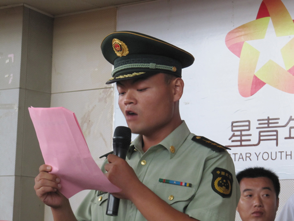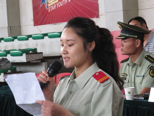 新生代表张玉媛代表全体新生作了“遵从纪律,服从命令;敢于吃苦,严格要求;团结友爱,互帮互助;文明礼貌,尊敬师长;意志坚定,刻苦训练”的庄严承诺。