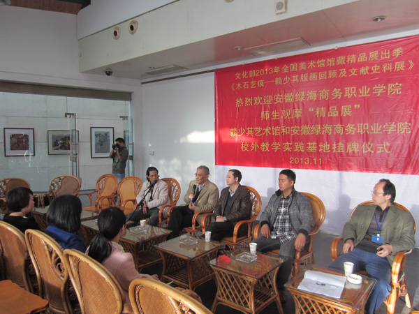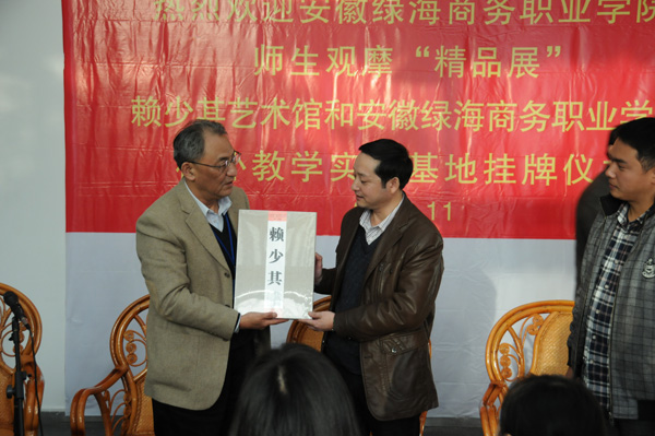 仪式上,艺术馆向我院赠送了两套精美的赖少其艺术作品集。张以亭副院长和于在海馆长共同为教学基地揭牌。张以亭副院长发表了讲话,他指出,赖少奇艺术馆文化艺术品位独特高雅,馆藏艺术珍品和文化史料丰富多彩,办馆理念科学先进,已经成为全国一流的文化艺术殿堂,也是合肥文化艺术的一张靓丽名片,在新徽派艺术的展示和传播上做出了重大贡献。