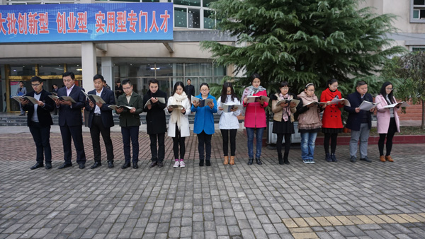 “我们是星青年!唱响中华的崛起强音,我们雄心报国;汲取绿海的知识琼浆,我们立志成才。”伴随着初升的太阳,经贸系大一大二学生齐聚科技楼前广场,在国旗下喊出了这样的誓言。