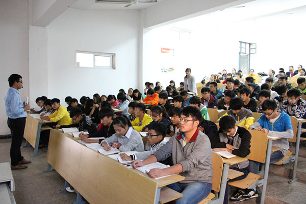 接下来,卢传胜用自己极富实战经验的实例和熟练的专业知识,通过娴熟地授课,带着大家学习了“互联网+的概念到提案、背景和实质”等,做了丰富精彩的演绎。其中PPT教案穿插图片、视频、案例等,让学生们更直观地了解并印象深刻。在讲到金融业态的改变时,他提到“宝宝时代”和“四国演义”等前沿概念,让同学们耳目一新。整个教学过程中同学们都凝神静气,认真听取老师的授课内容,不愿错过点滴精彩。课程结束,台下的学生们自发响起热烈的掌声。