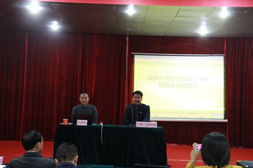 10月10日,知名国学专家、河南先锋学校校长任晓林在学院报告厅作了题为《国学与民办高校教育发展趋势及特色定位》专题报告。香港孔教学院副院长、南京诚明书院院长徐洪磊,南京诚明书院常务副院长陈德云一行应邀参加绿海大讲堂系列活动“国学讲堂”报告。学院董事长陈孝云,党政领导江传瑞、陈孝江、张以亭、常林虎、孙成玖等出席报告会,全院科级以上干部聆听了报告。