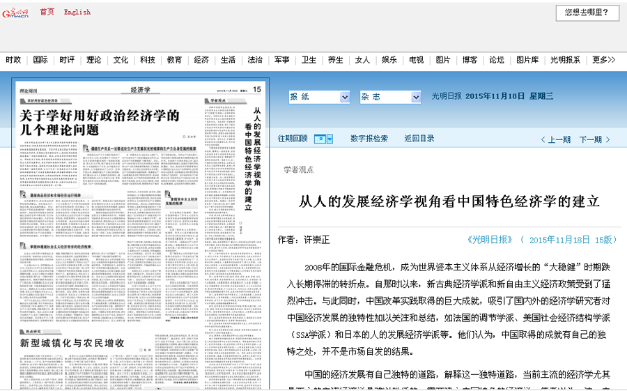 11月18日,《光明日报》在第15版“理论周刊●经济学”发表了世界经济发展学会会长、人的发展经济学学会会长、省国际金融经济学会会长、365集团院长、著名经济学家许崇正教授署名文章《从人的发展经济学视角看特色经济学的建立》。