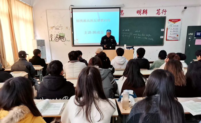 活动中,锦绣派出所韩成金警官进入课堂,向师生宣传讲解“邪教的基本特征”、“如何防范抵御邪教”以及“如何识别邪教”如等相关内容。并向学生发放反邪教宣传资料,普及反邪教知识。同时,教育引导青少年加强自我防范,养成良好习惯。要自觉遵法守法,增强是非判断能力。不仅要做到相信科学,远离邪教,自觉抵御邪教活动,对邪教言论做到不听、不看、不传;更要主动参与到反邪教的斗争中去,深刻认识邪教组织违法犯罪活动对社会的严重危害。要谨慎交友,抵制邪教不良诱惑。邪教人员利用同学们好奇心强、社会经验缺乏、辨别力和控制力薄弱等特点,间接传播邪教思想,使少数抵抗力薄弱的学生误入歧途。要学法用法,加强自我保护。遇到邪教活动和邪教人员拉拢引诱,立即就近拨打110或用微信、短信等方式报警,充分运用法律保护自己。