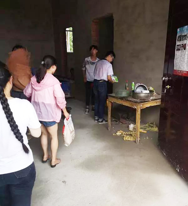 刘阿凤小朋友家里姐弟4人,母亲患有精神疾病,所以4个孩子也都有遗传。在去的路上,刘尧小学的老师介绍说家里第三个孩子前段时间患了脑膜炎,家里环境也比较脏乱,阿凤的爸爸说第三个孩子又因为脑膜炎发烧在住院,他回家是看看在家犯病的妻子和第四个孩子的,我们带着生活用品和学习用品到达家里的时候有点无措,除当地政府帮忙盖的房子外家里没有一件像样的家具,新盖的房子上也没有窗户。此外,团队成员通过该村组负责人还了解了留守儿童的教育、生存和生活等现状。