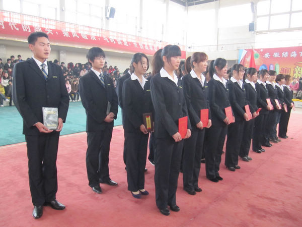 此次典礼中较为突出的一部分内容即欢送旅游管理专业10名赴北京参加全国“两会”服务的学生。黄天驰、束海峰、路曼等10名优秀学生突破重围,脱颖而出,前往全国“两会”指定后勤服务单位北京新世纪日航饭店从事接待服务工作。赴京代表黄天驰同学在向全体师生的宣誓中,庄严承诺他们将谨记使命,竭尽全力,圆满完成任务。