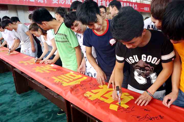 宣誓完毕,工商管理系学生按班级顺序在诚信考试横幅上郑重签名。学生会成员将诚信考试横幅悬挂于学院主干道上。