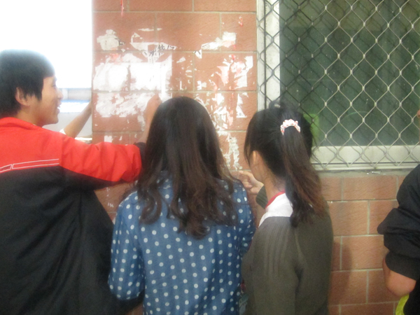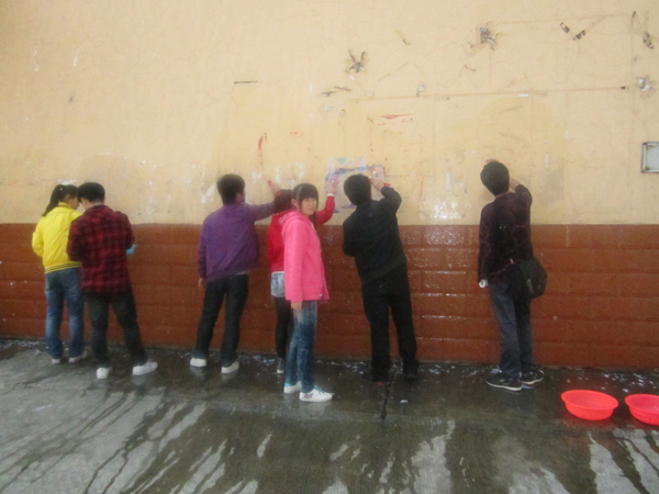 中午12点,同学们带着脸盘,刷子前往各自的阵地,清理校园内的小广告、过期的海报、横幅等。