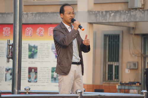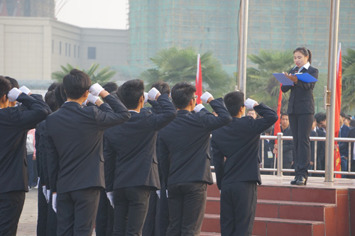 随着整齐的步伐和嘹亮的口号,国旗护卫队队员们护卫着鲜红的五星红旗庄严的步入广场。在庄严的国歌声中,在场老师和同学集体行注目礼,神情肃然的看着国旗冉冉升起,全场庄严肃穆。之后,学生代表陈淼带领大家庄严宣誓。