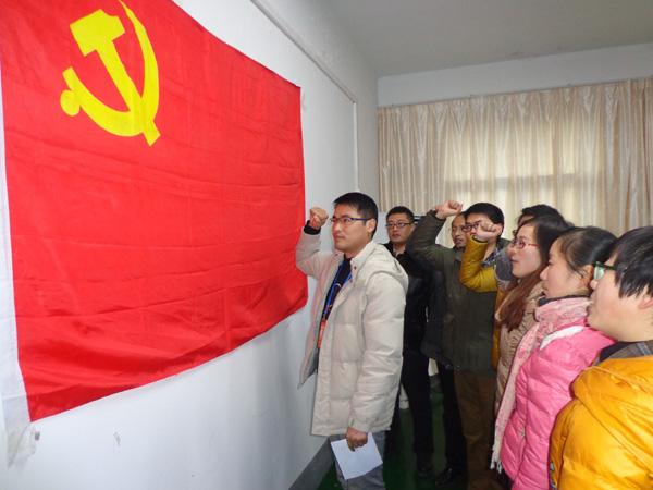 表决通过后,经济贸易系党总支副书记高明亲自带领转正的党员同志列队面向党旗,举起右手庄严宣誓。 高明记对通过本次大会讨论通过的7名同志表示热烈祝贺,他指出:我和党员有多大差距?入党之后应该如何做?这也在提示我们党员,我们要时刻牢记每一个人自己的入党时的誓言,本着养心养德的道德自律、求真务实的工作态度用一生的行动践行我们坚定的誓言。