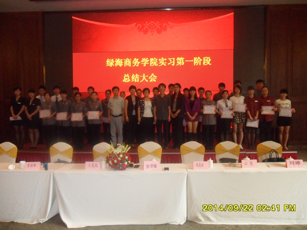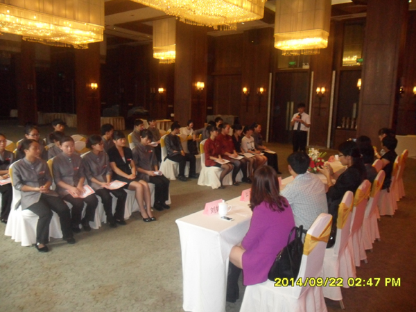 为了更好了解我系实习生的实习状态,确保学生高质量的完成实习任务,9月22日下午,管理系主任张学锋等一行4人前往同庆楼餐饮集团看望在该企业实习的我院首届“同庆班”——12级餐饮管理专业学生,并参加“同庆班”实习期第一阶段总结表彰大会暨同庆班奖学金发放仪式。下午2:30分,实习总结表彰大会暨奖学金发放仪式在同庆楼庐州府大酒店同庆厅隆重举行。系主任张学锋、党总支副书记钱曼丽、同庆楼人力资源中心经理王美凤、招聘部经理曹丽娜、12级餐饮管理专业辅导员江亮、校内实习指导老师刘婷及12级餐饮管理专业全体实习学生参加了大会。大会由同庆楼餐饮集团培训部经理洪梅主持。
