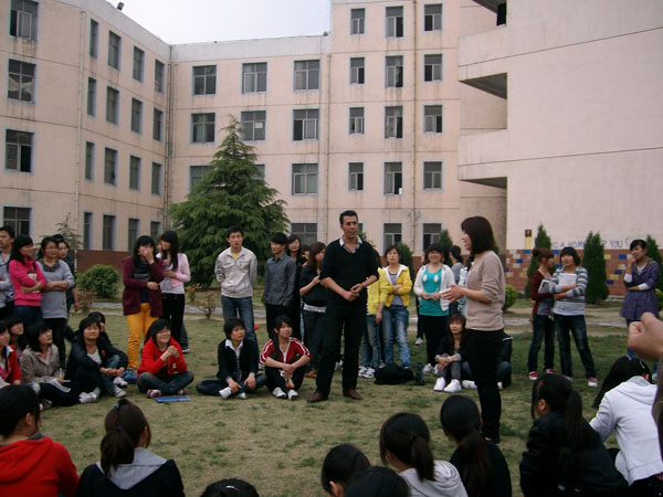 英语角活动在我院科技楼门前草坪正式拉开序幕。外教Bob用诙谐幽默的语言为同学们讲述自己的文化习俗和自己生活中有趣的事情。同学们听得津津有味并踊跃地参与到交流中,主动向老师请教问题。