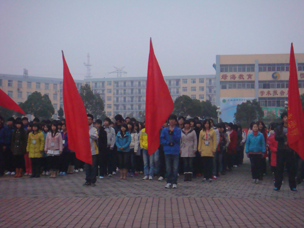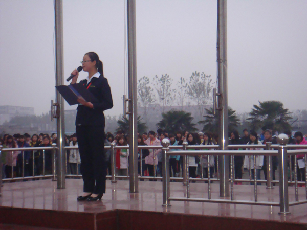 在雄壮的乐曲声中,国旗护卫队成员踏着整齐的步伐、精神抖擞地进入广场。国歌响起,红旗飘扬,全场一片肃穆。学生代表张敏同学带领全体学生在国旗下庄严宣誓。