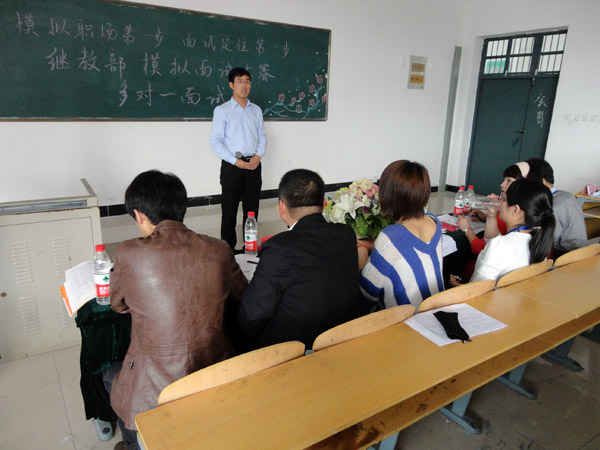 4月23日下午,我院继续教育部会电c101、c102班在阶梯教室里举办了一场别开生面的校园模拟面试大赛。教务处、经贸系、继教部六位老师莅临了本次大赛现场。本次活动由会电班辅导员魏明老师主办,共有14位参赛选手。