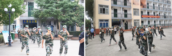 13:50,演练总指挥发出“演练开始”的指令,宿舍楼出现橙色模拟火情浓烟,警报声随即响起。保卫处立即组织人员赶赴楼层进行模拟灭火演练,医务救护组人员在一旁待命,随时准备急救。各楼学生在辅导员、宿舍管理人员、军训教官的引导下,按照预案要求,用湿毛巾掩住口鼻、低姿弯腰沿安全通道快速有序撤离,到达指定疏散集结点。演练现场组织有序,所有人员均安全撤离。