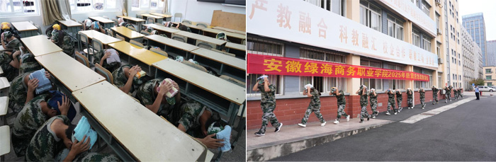 14:30,参演师生转场至教学楼教室,随着模拟“地震”警报信号发出,学生按照地震应急避险要求,迅速蹲下,蜷曲身体,降低身体重心,双手护头,就近躲在课桌下进行避震。 随着疏散指令发出,师生双手护头按照预定疏散路线,快速、有序的撤离教学楼向指定集合点疏散。同时,辅导员、保卫人员、军训教官在楼道、楼梯口等处加以指引、疏导,防止出现拥挤、踩踏。师生全部安全撤离到指定疏散集合点。